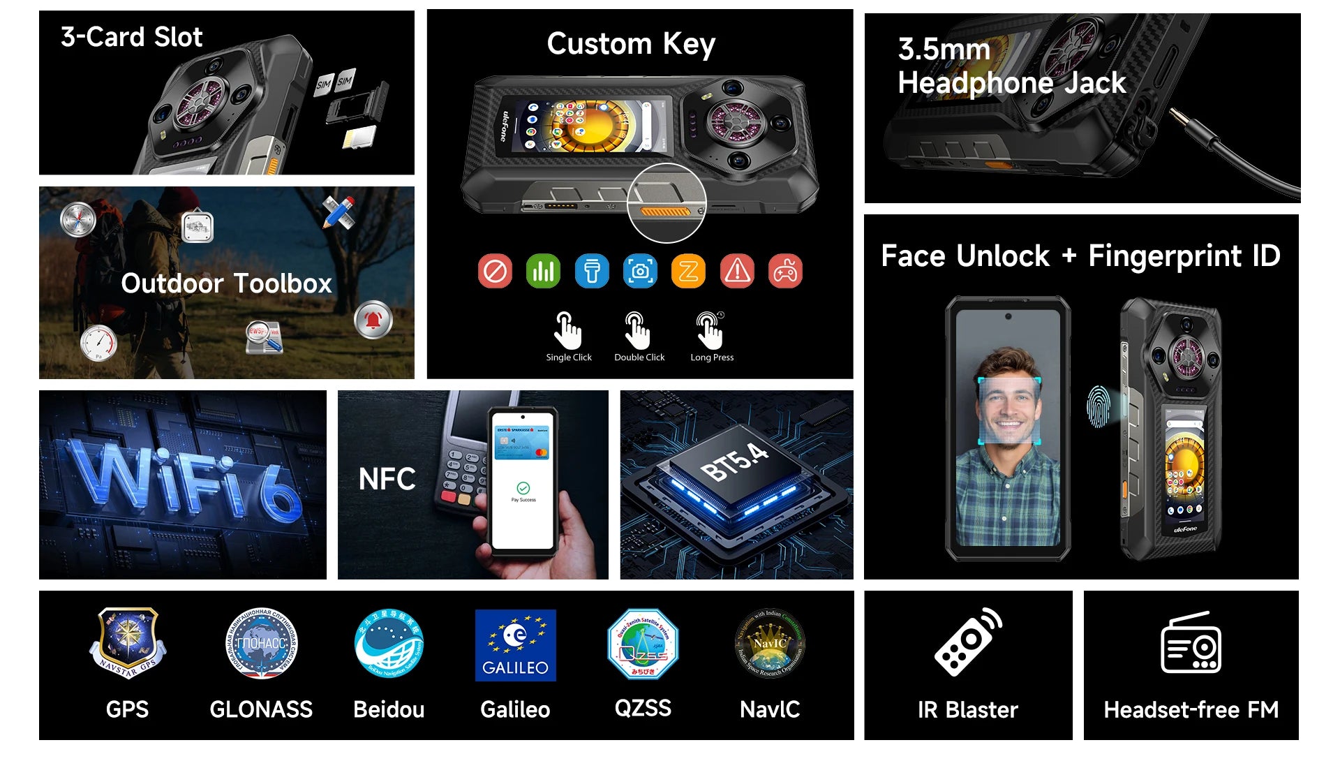 SPECIFICATIONS3.5mm Headphone Port: YesBattery Capacity Range: 7500+ mAhBattery Capacity(mAh): 12800Battery Type: Not DetachableBiometrics Technology: Side-Mounted,Face RecognitionBluetooth Version: YESBrand Name: ULEFONEBuilt-in GPS: NoCPU Model: MTKCellular: 3G,2 G,4G,5 GCertification: CE,FCC,RoHS,weeeCharging Interface Type: Type-CCharging Power: 66WDesign: BarDisplay Resolution:...