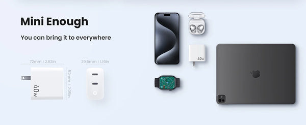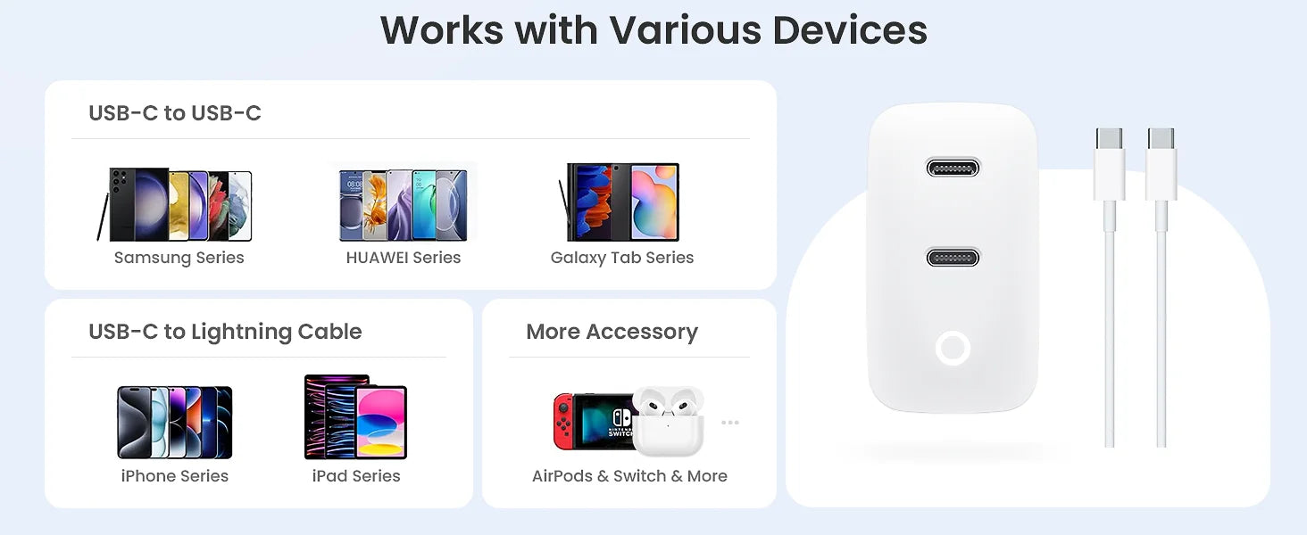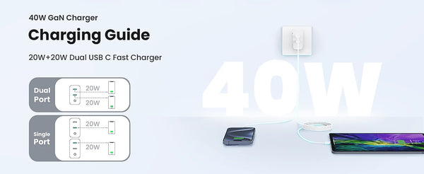 40W 2 Ports USB-C Type-C GaN Fast Charger with Charging Light, Fast Charging Block with 3.3Ft Type-C Charging Cable For IPhone