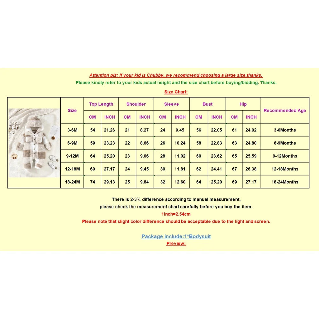 Baby Boys and Girls Plaid Romper Hooded Long Sleeved Plush Jumpsuit Winter Warm Bodysuit Clothes for 3-24 Months Toddler Boy